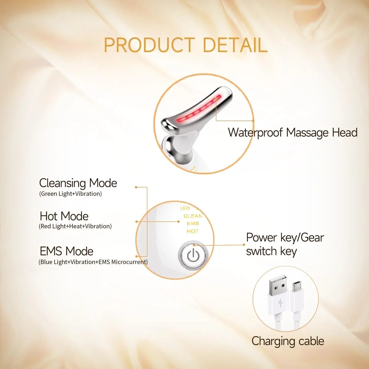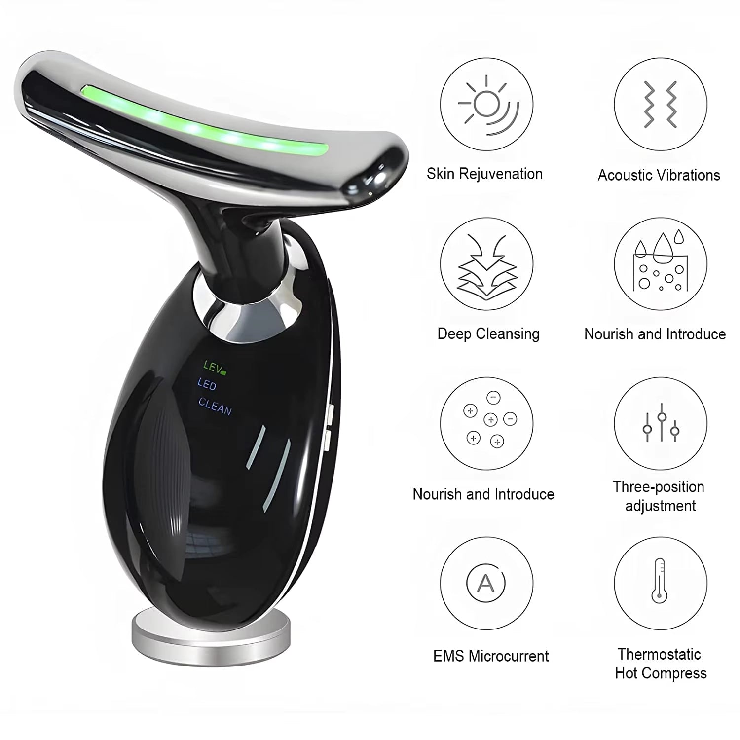 Three Adjustable Modes for Customized Treatment Featuringthree intensity levels, this device allows personalized skincare routines to target wrinkles, fine lines, and double chin fat. The gentle yet firm vibrations enhanceblood circulation and lymphatic drainage, helping to detoxify pores, reduce puffiness, and promote a firmer, more youthful complexion.